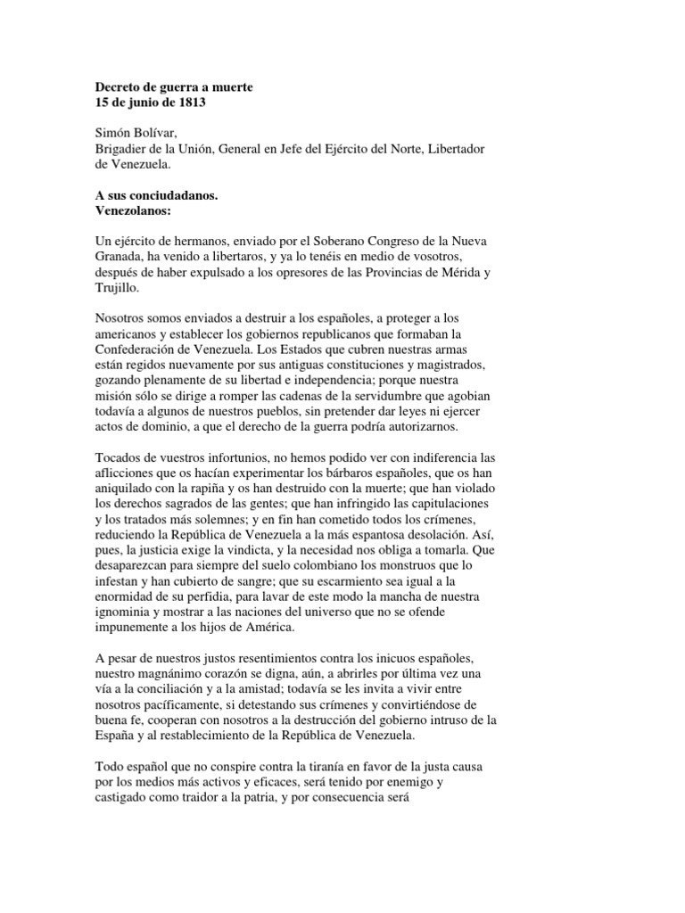 El calendario de las selecciones en el mundo del fútbol continúan. Savesave decreto de guerra a muerte for later. A pesar del amor que sientes por esa persona, tu mente está interfiriendo en tus sentimientos llenándote de cuestionamientos que te llevarían a tomar una 13 de junio de 2021. Proclama de guerra a muerte. Miranda capitula frente a monteverde.