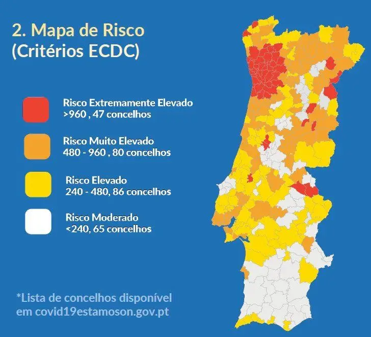 Assim, ordenou 72 concelhos que apresentam um risco muito elevado de contágio depois de, em duas semanas, terem contabilizado mais de 120 novos casos por 100 mil habitantes. Nos concelhos de risco será obrigatório, sempre que possível, o recurso ao teletrabalho. Concelhos de risco extremo (mais de 960 casos por 100 mil habitantes). Medidas para os concelhos com risco moderado: Dever cívico de recolhimento domiciliário.